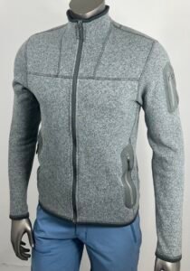 - Design: Full-zip cardigan, laminated hand pockets, high collar.
